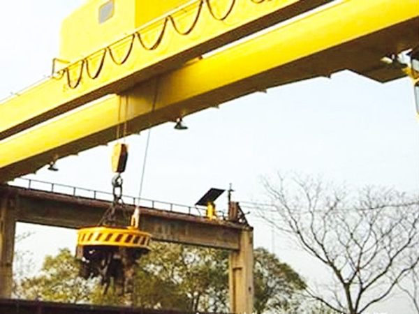 電磁橋式起重機(jī)的基本構(gòu)造與吊鉤橋式起重機(jī)相同,不同的是吊鉤上掛1個直流起重電磁吸盤,用來吊運具有導(dǎo)磁性的黑色金屬及其制品。通過裝在司機(jī)室內(nèi)的可控硅直流箱將交流電源轉(zhuǎn)換為直流電源,然后再通過設(shè)在小車上的專用電纜卷筒,將直流電源用電纜送到電磁吸盤上。