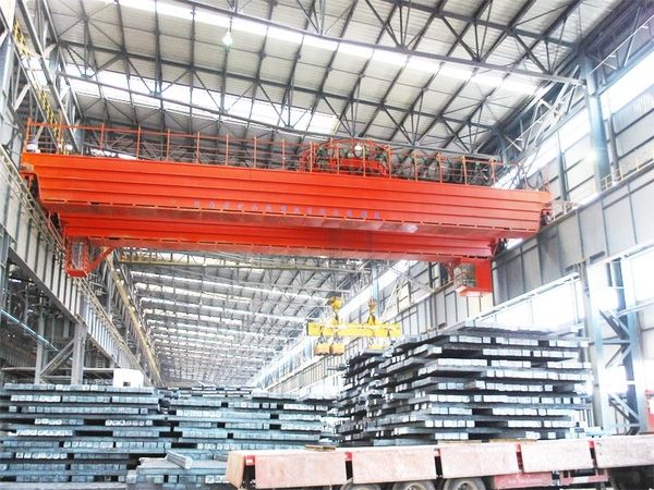 用于搬運(yùn)長件板坯、棒材等黑色金屬?;剞D(zhuǎn)通過兩種形式實(shí)現(xiàn),一種形式為掛梁回轉(zhuǎn),即掛梁為雙層結(jié)構(gòu),上層掛梁通過滑輪組與鋼絲繩纏繞,下層掛梁配有多臺(tái)電磁吸盤或夾鉗,可隨驅(qū)動(dòng)機(jī)構(gòu)回轉(zhuǎn)一定角度。另一種形式為小車回轉(zhuǎn),即小車為雙層結(jié)構(gòu),上層小車布置有起升機(jī)構(gòu),下層小車為運(yùn)行小車,上面鋪設(shè)有環(huán)形軌道,上層小車可沿環(huán)形軌道回轉(zhuǎn)。